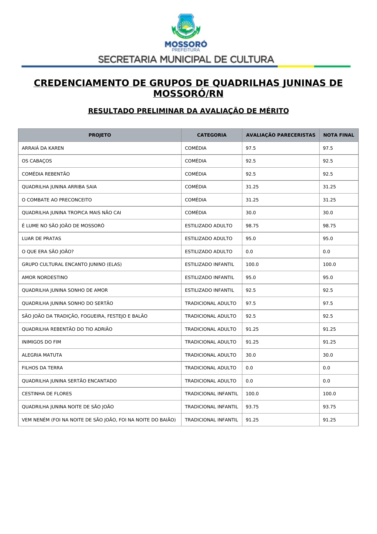 CREDENCIAMENTO DE GRUPOS DE QUADRILHAS JUNINAS DE MOSSORÓ/RN 2026