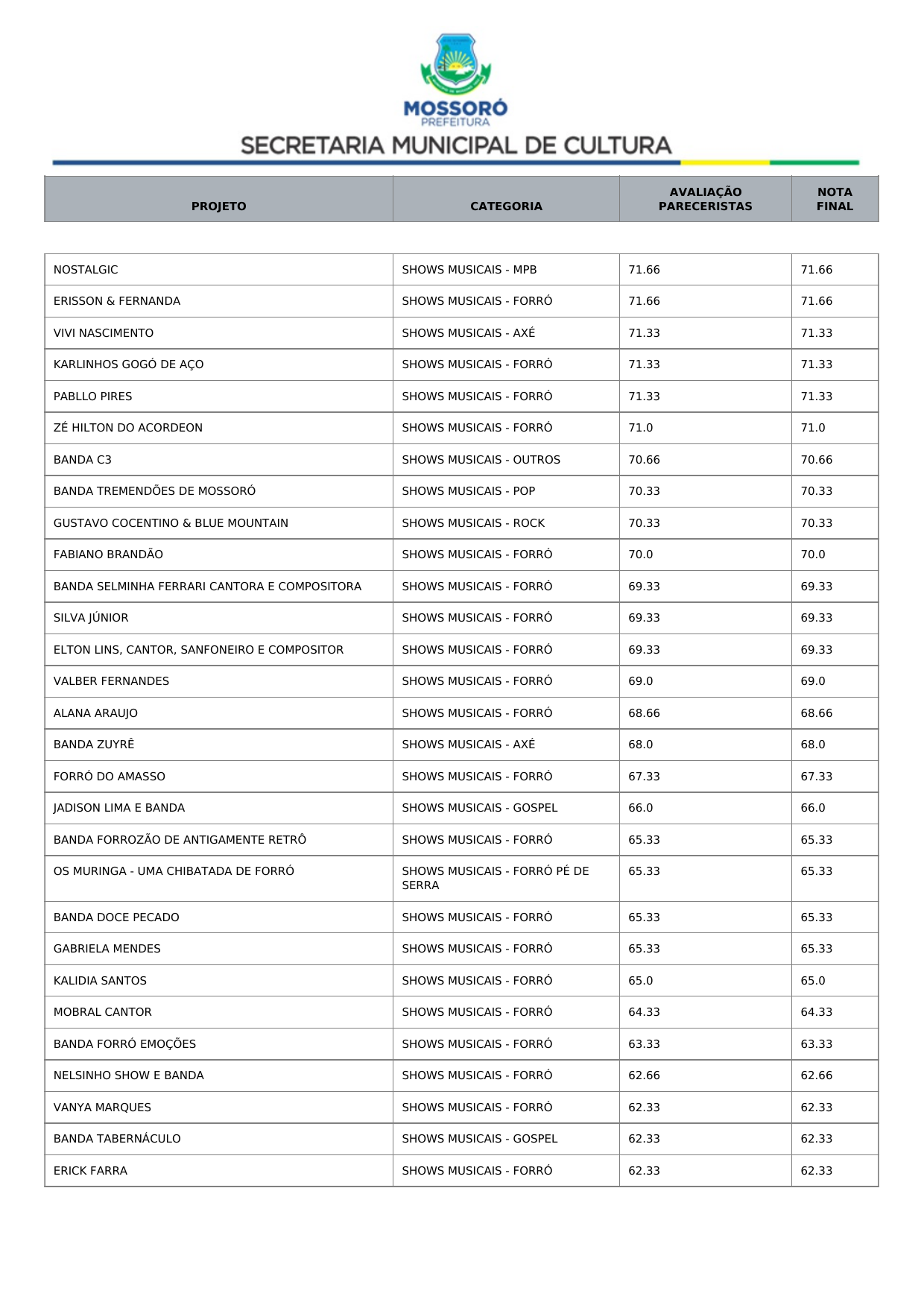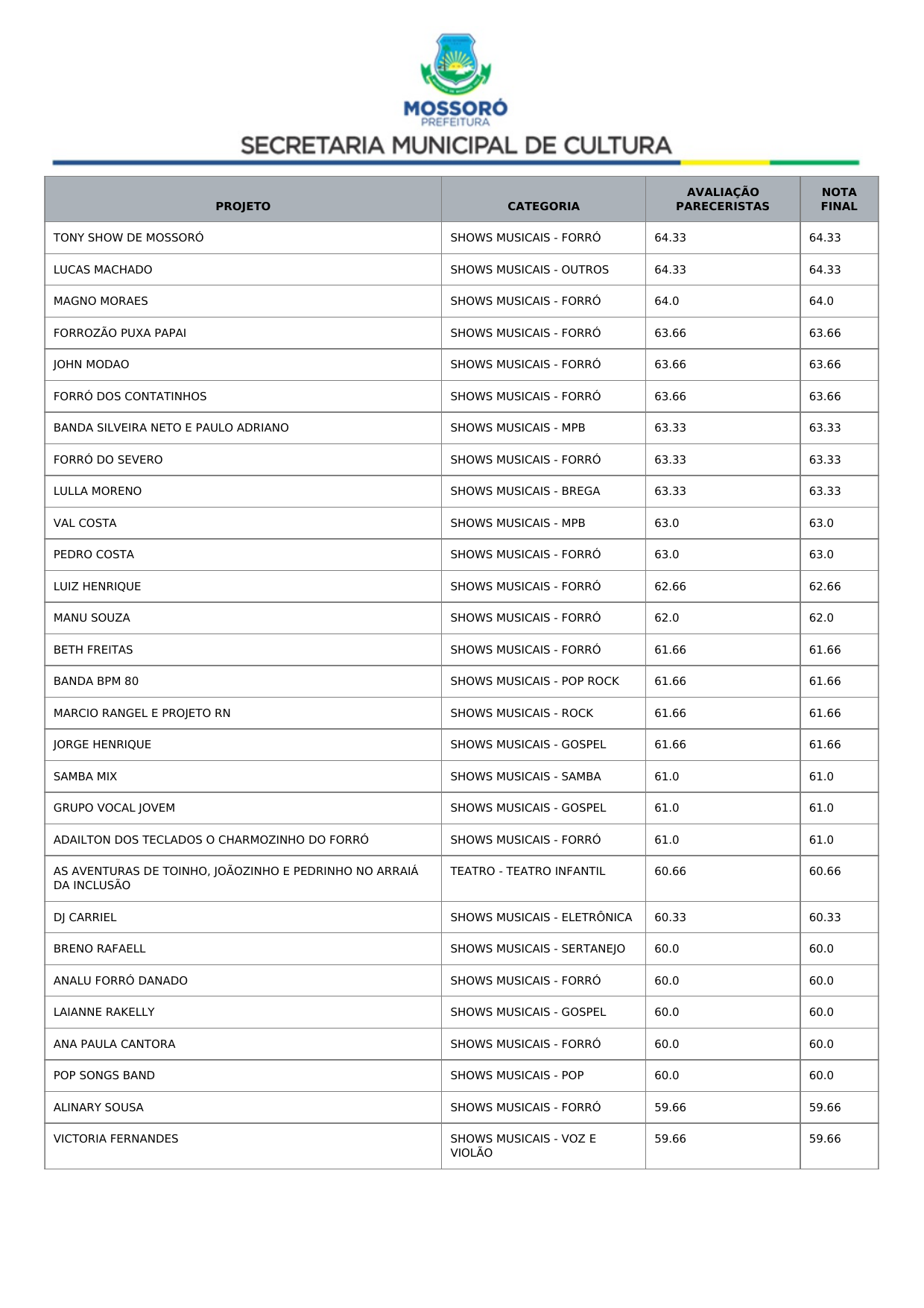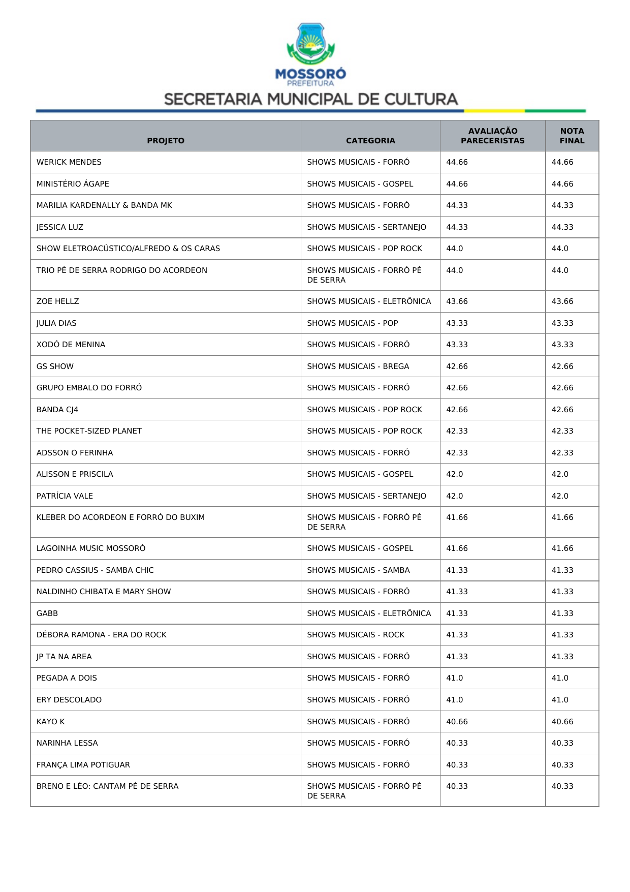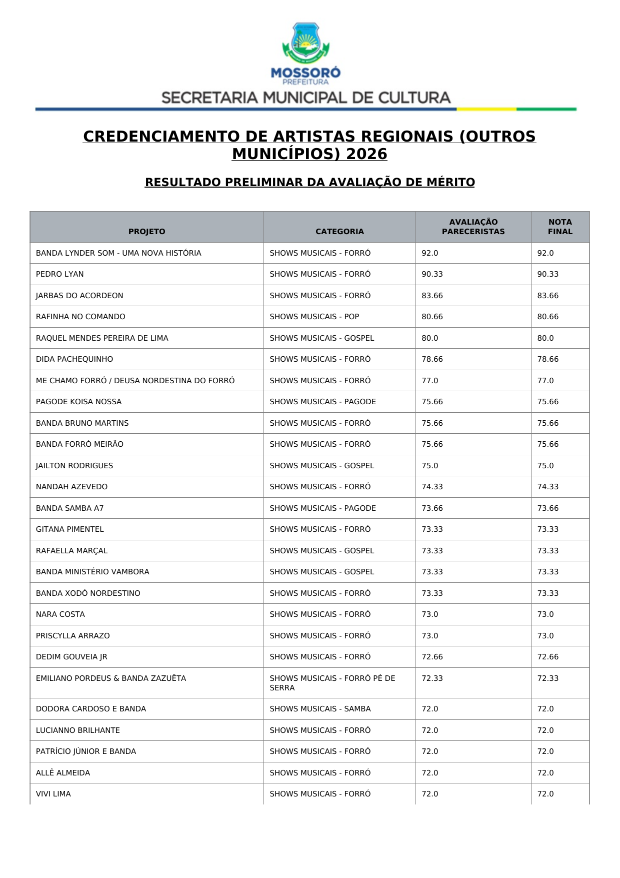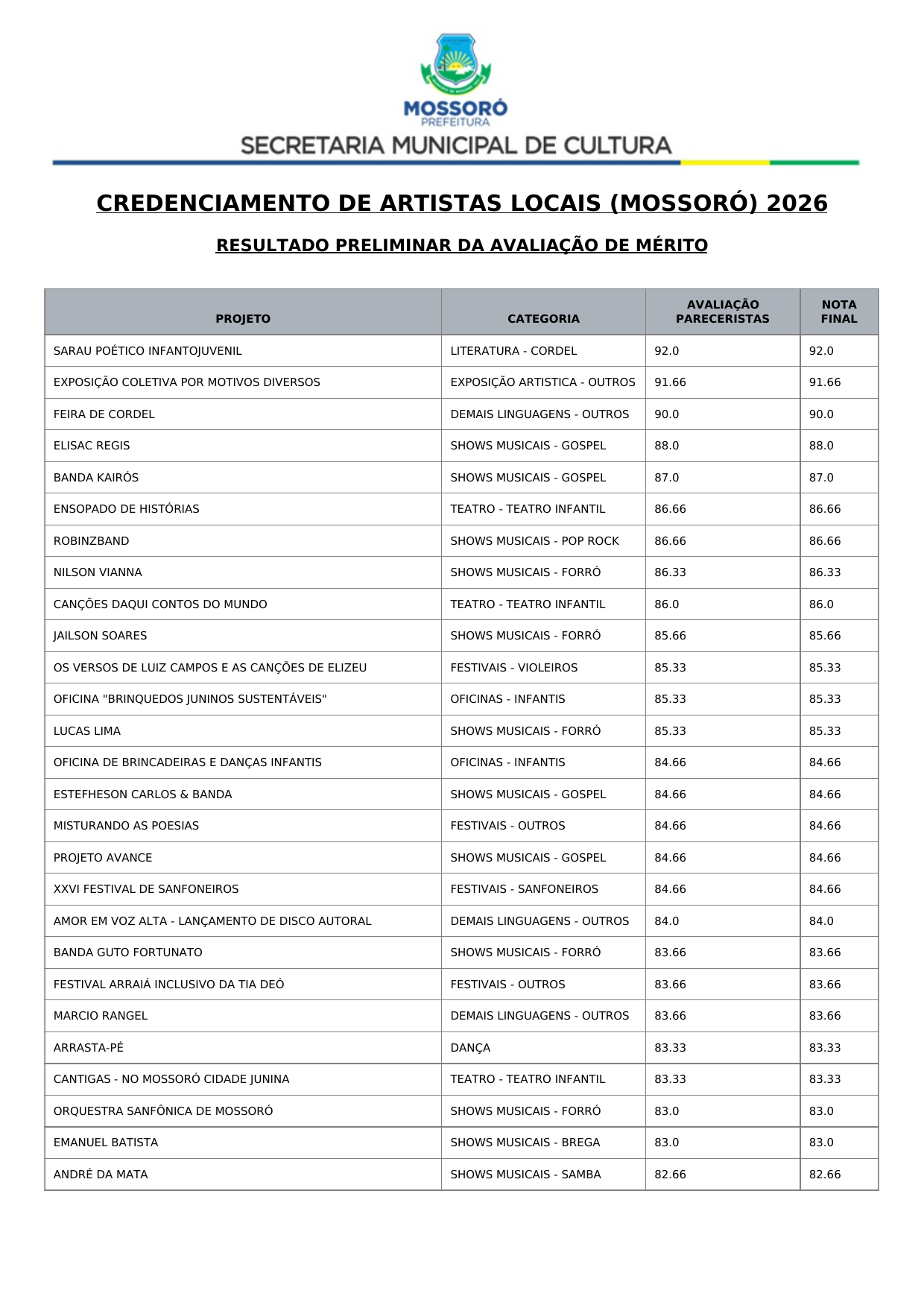 Art. 1º Tornar público o Resultado Preliminar da Análise de Mérito Artístico e Cultural das propostas submetidas no âmbito do Credenciamento nº 01/2026 – SMC, destinado à seleção de atividades musicais, artísticas e culturais, em todas as suas manifestações e linguagens, para compor a programação oficial dos eventos Mossoró Cidade Junina 2026 e Mossoró Sal e Luz 2026.