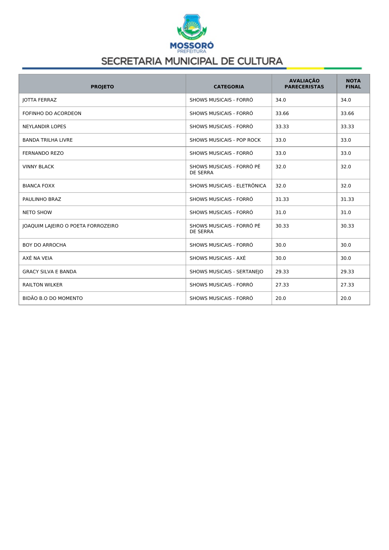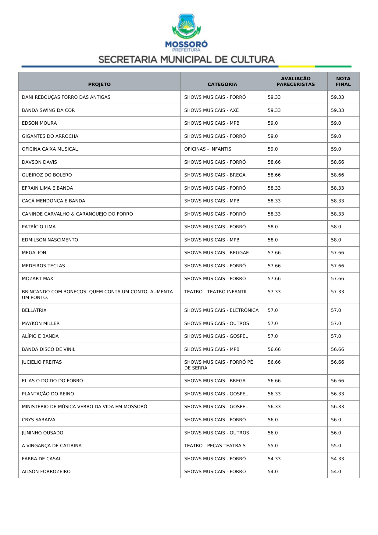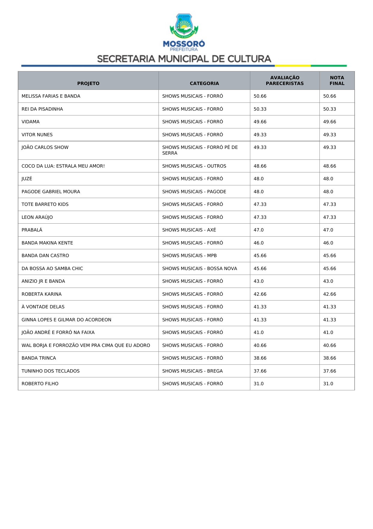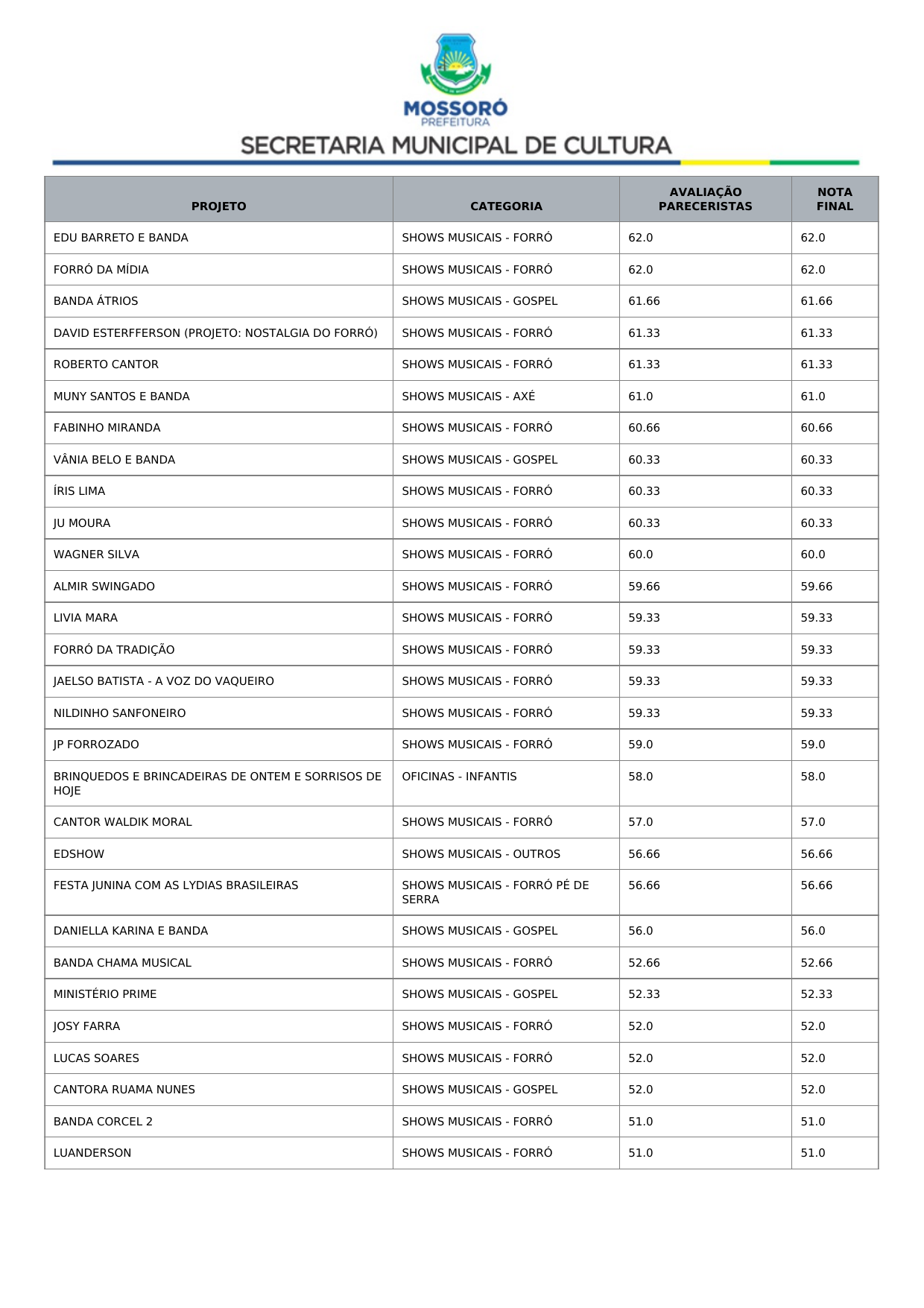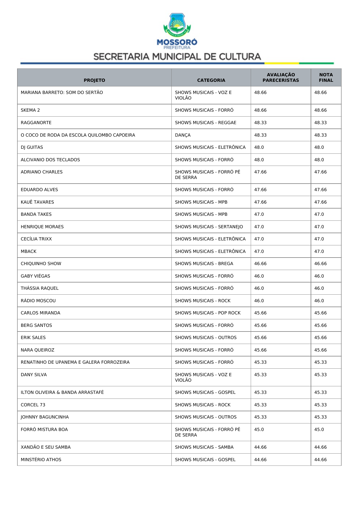 Art. 1º Tornar público o Resultado Preliminar da Análise de Mérito Artístico e Cultural das propostas submetidas no âmbito do Credenciamento nº 01/2026 – SMC, destinado à seleção de atividades musicais, artísticas e culturais, em todas as suas manifestações e linguagens, para compor a programação oficial dos eventos Mossoró Cidade Junina 2026 e Mossoró Sal e Luz 2026.