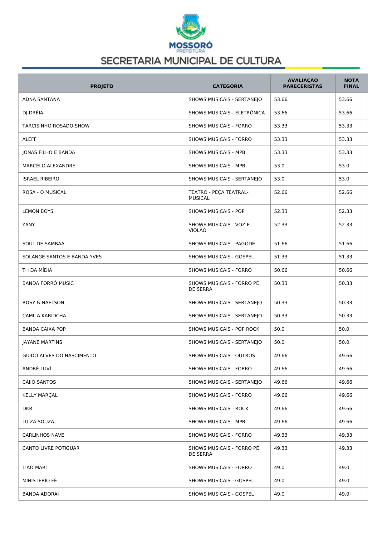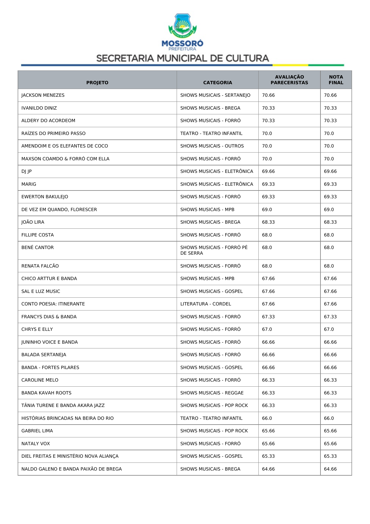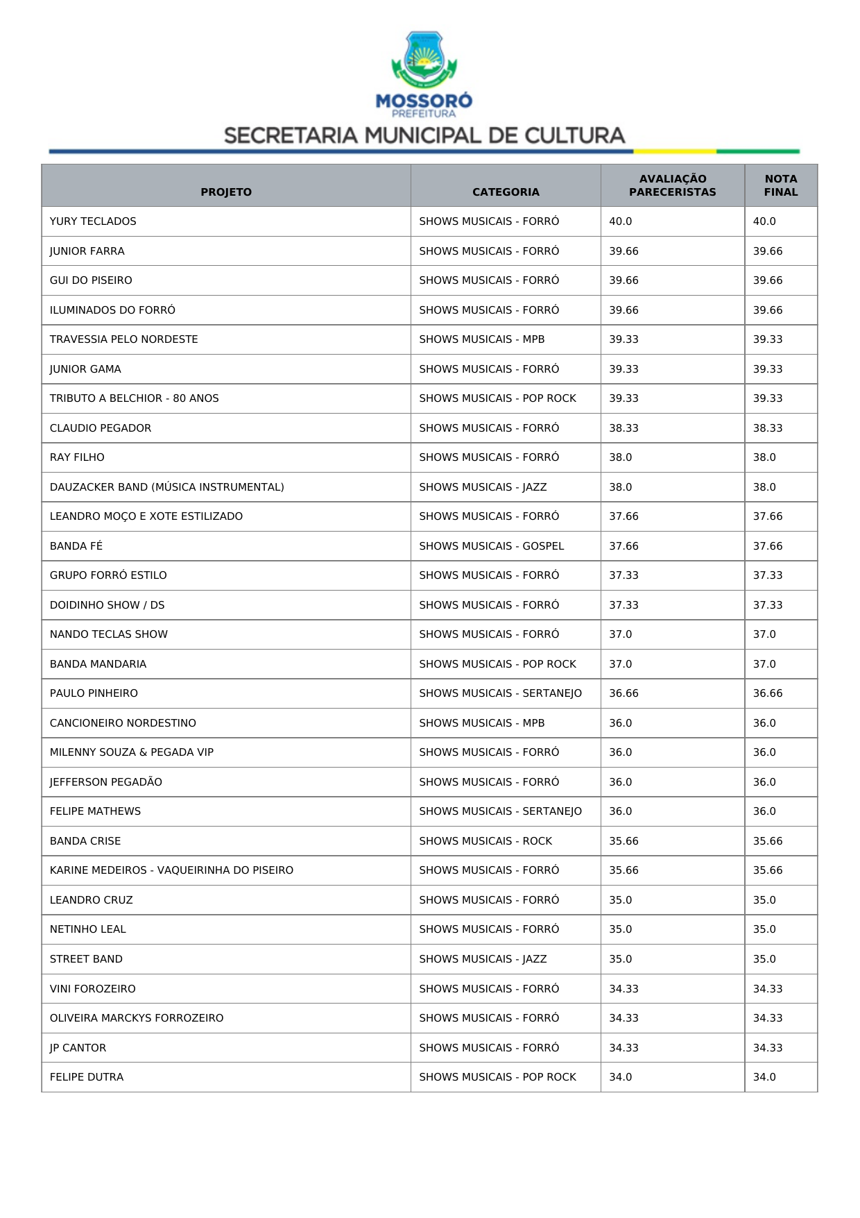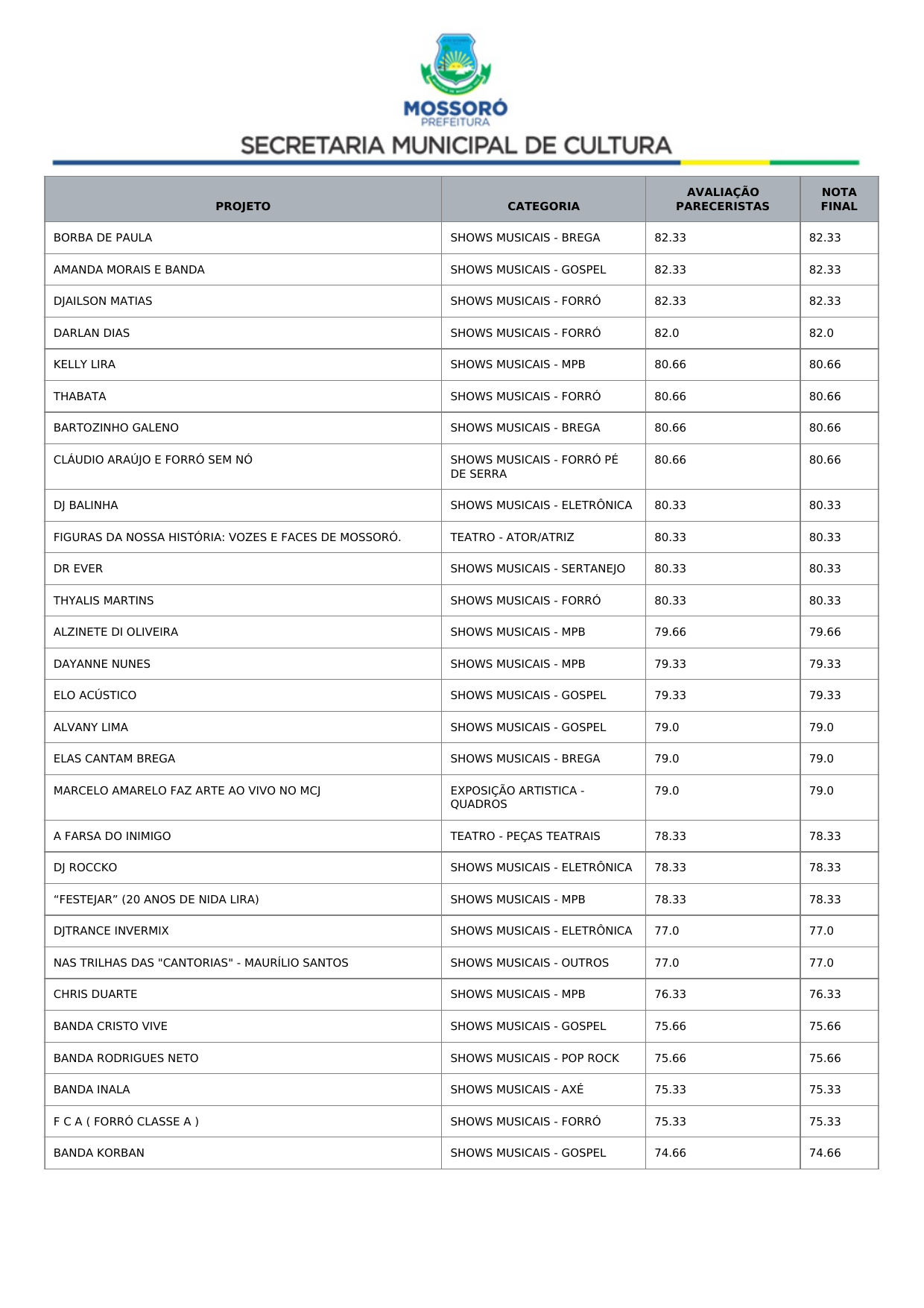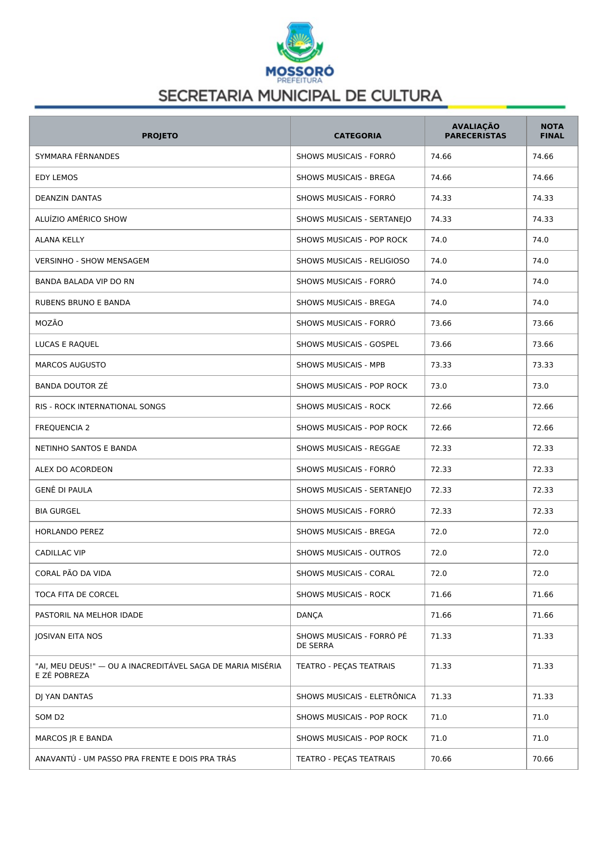 Art. 1º Tornar público o Resultado Preliminar da Análise de Mérito Artístico e Cultural das propostas submetidas no âmbito do Credenciamento nº 01/2026 – SMC, destinado à seleção de atividades musicais, artísticas e culturais, em todas as suas manifestações e linguagens, para compor a programação oficial dos eventos Mossoró Cidade Junina 2026 e Mossoró Sal e Luz 2026.